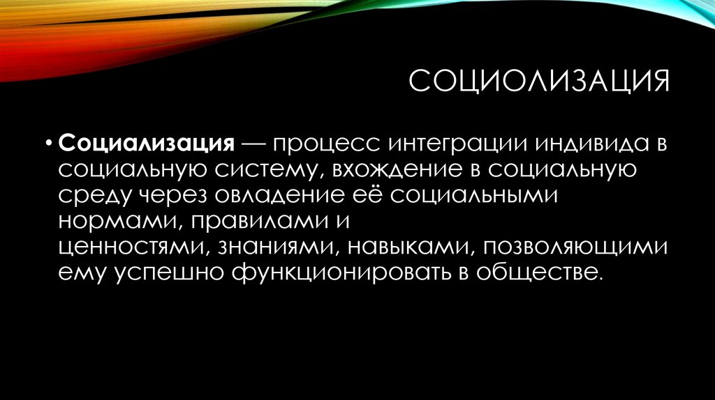 СОЦИОЛИЗАЦИЯ• Социализация — процесс интеграции индивида в