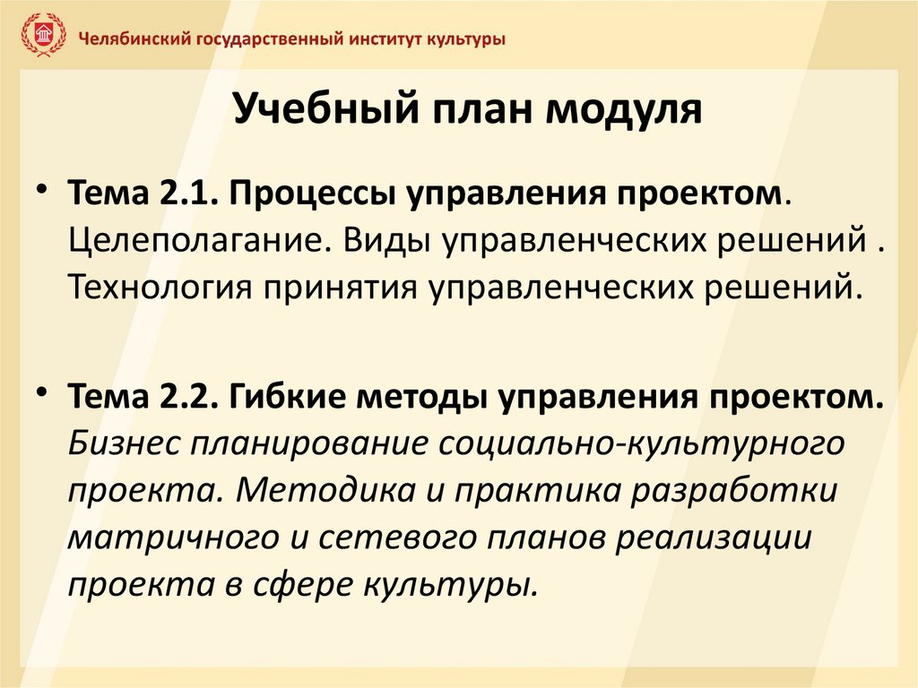 Учебный план модуля• Тема 2.1. Процессы управления проектом.