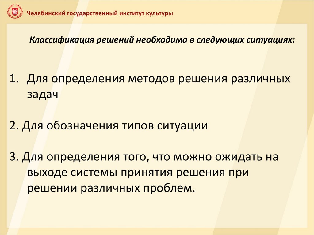 Классификация решений необходима в следующих ситуациях:1. Для определения методов решения различных