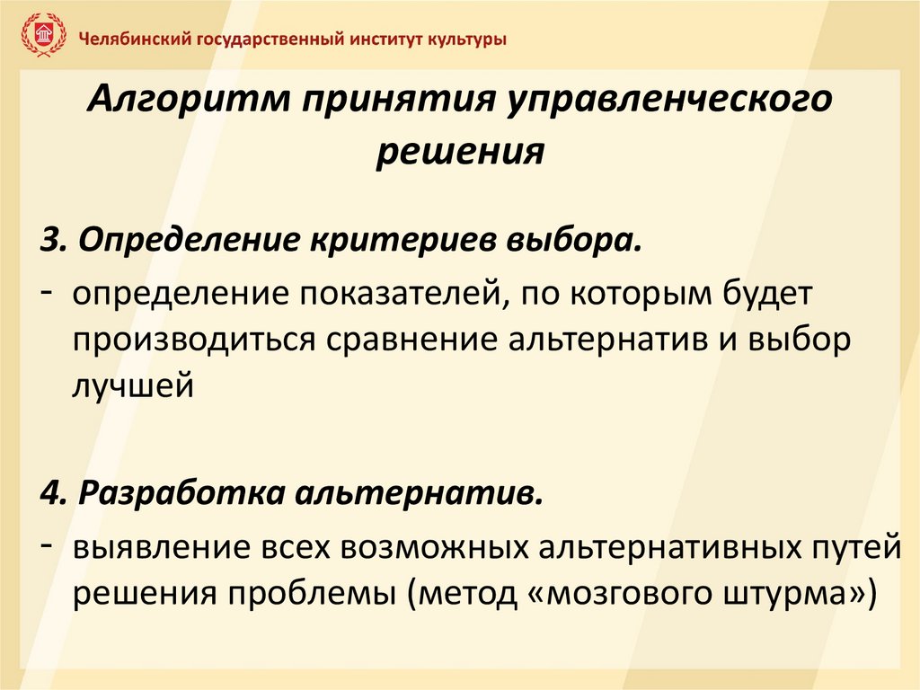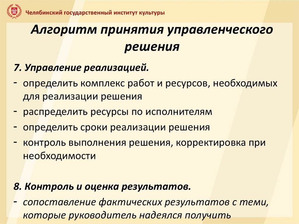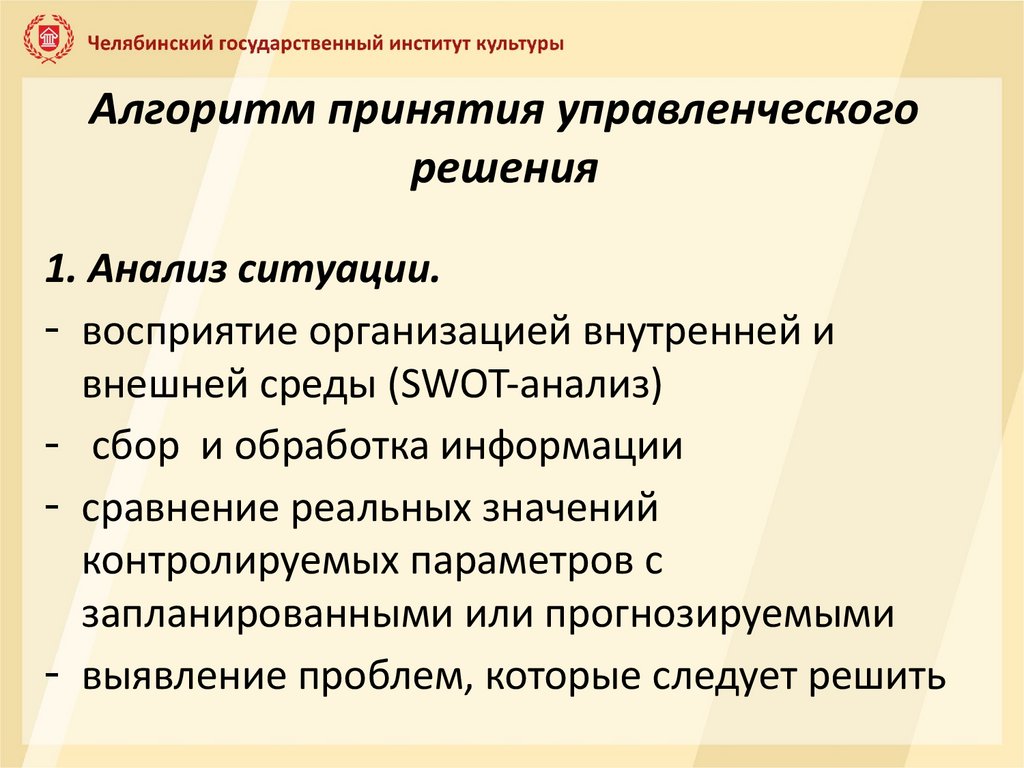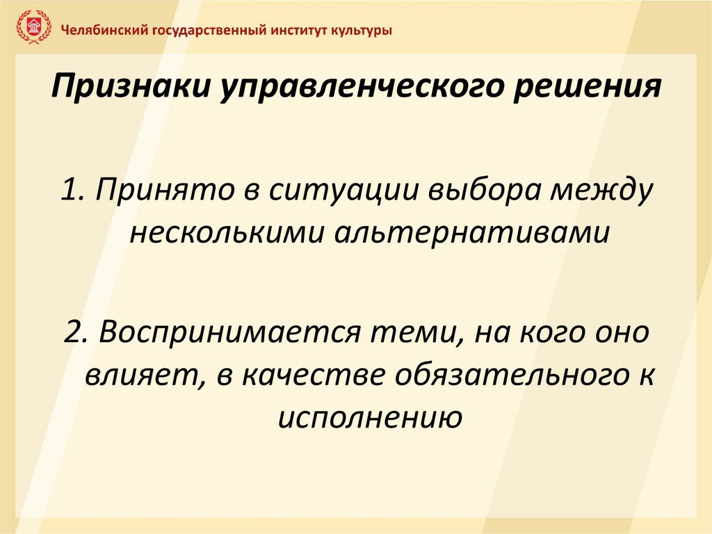 Признаки управленческого решения1. Принято в ситуации выбора между