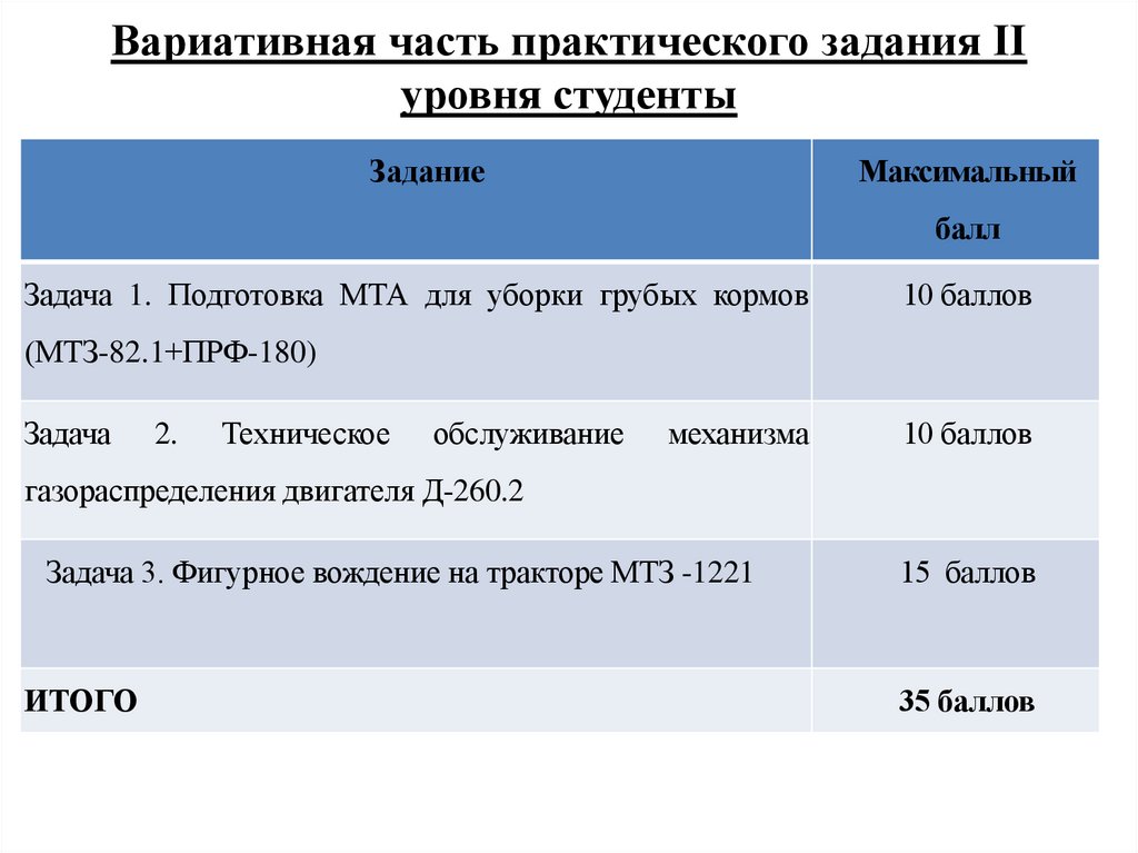 - вариативная часть практического задания II уровня - 35 баллов.