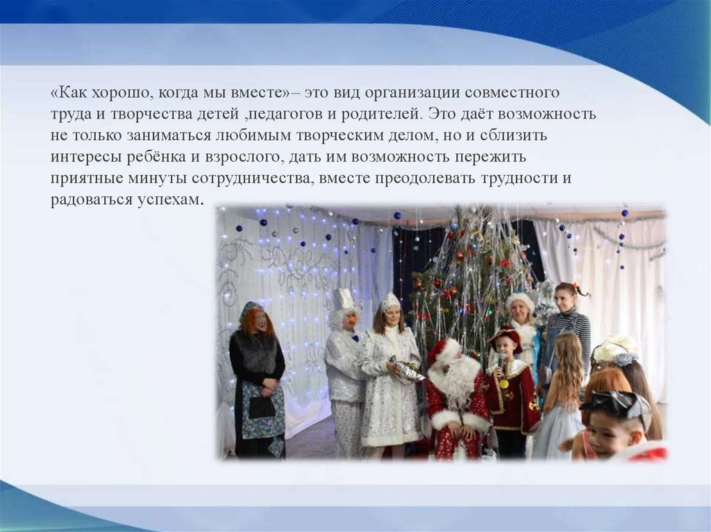 «Как хорошо, когда мы вместе»– это вид организации совместноготруда и творчества детей ,педагогов и родителей. Это даёт возможность