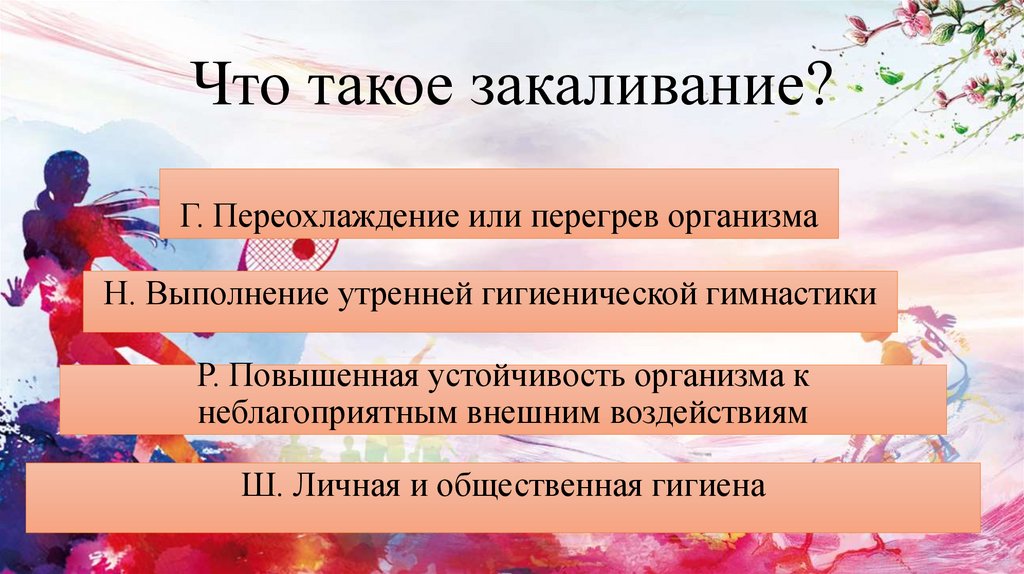 Что такое закаливание?Г. Переохлаждение или перегрев организма