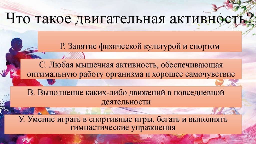 Что такое двигательная активность?Р. Занятие физической культурой и спортом
