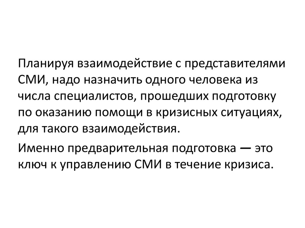 Планируя взаимодействие с представителямиСМИ, надо назначить одного человека из