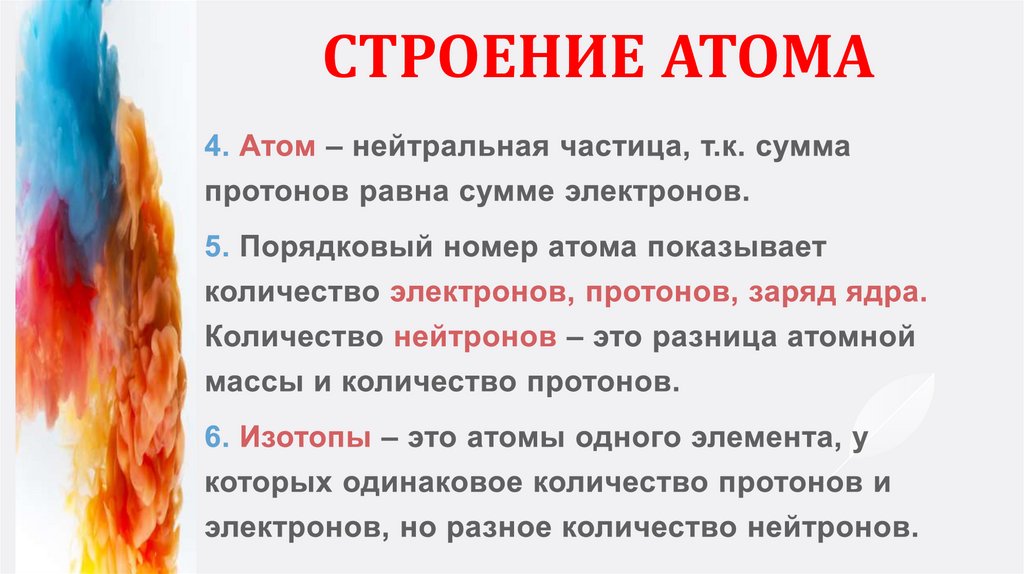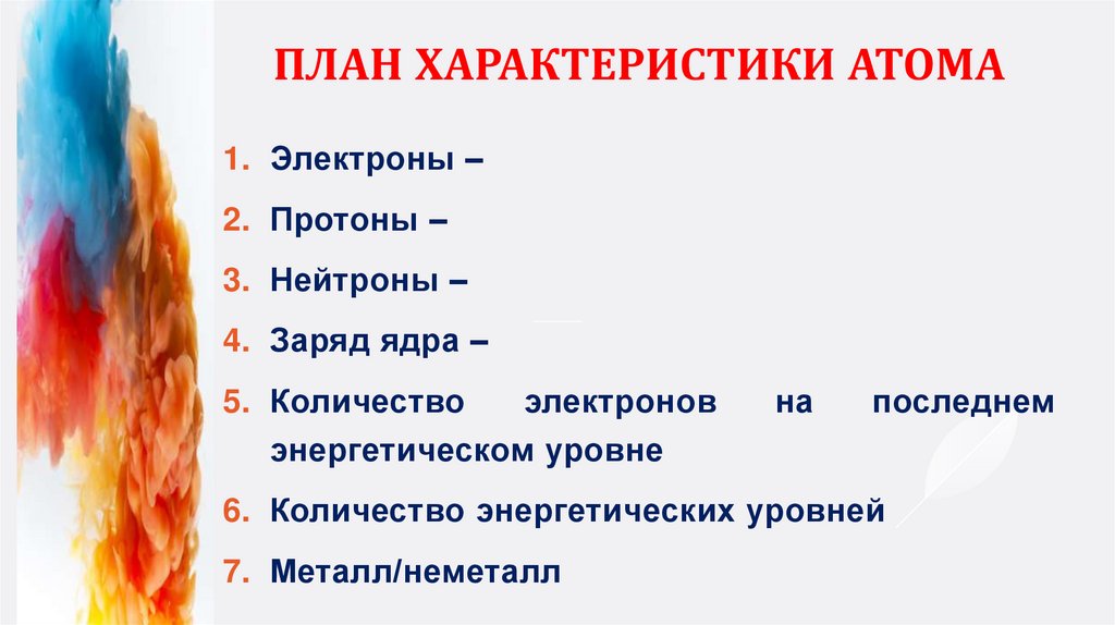 ПЛАН ХАРАКТЕРИСТИКИ АТОМА1. Электроны –