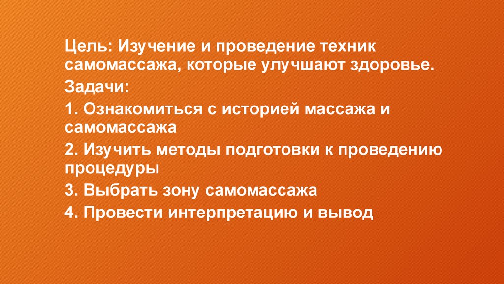 Цель: Изучение и проведение техниксамомассажа, которые улучшают здоровье.