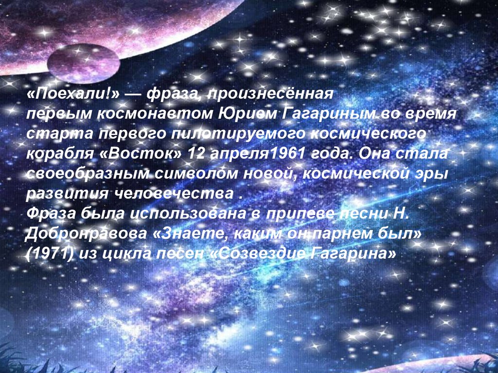 «Поехали!» — фраза, произнесённаяпервым космонавтом Юрием Гагариным во время