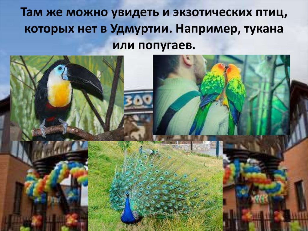 Там же можно увидеть и экзотических птиц,которых нет в Удмуртии. Например, тукана
