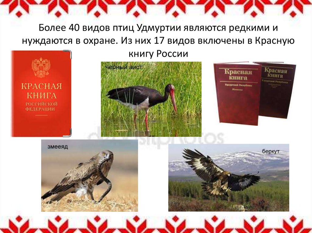 Более 40 видов птиц Удмуртии являются редкими инуждаются в охране. Из них 17 видов включены в Красную