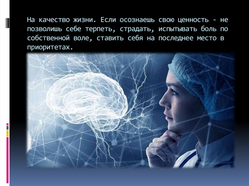 На качество жизни. Если осознаешь свою ценность - непозволишь себе терпеть, страдать, испытывать боль по