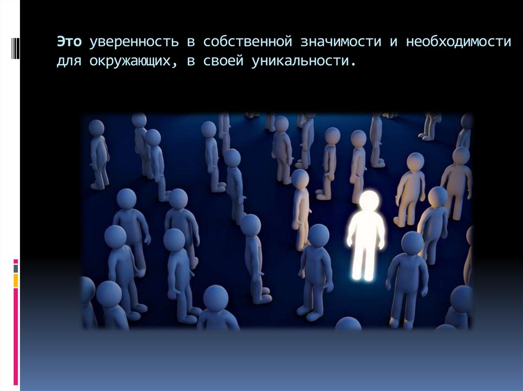 Это уверенность в собственной значимости и необходимостидля окружающих, в своей уникальности.