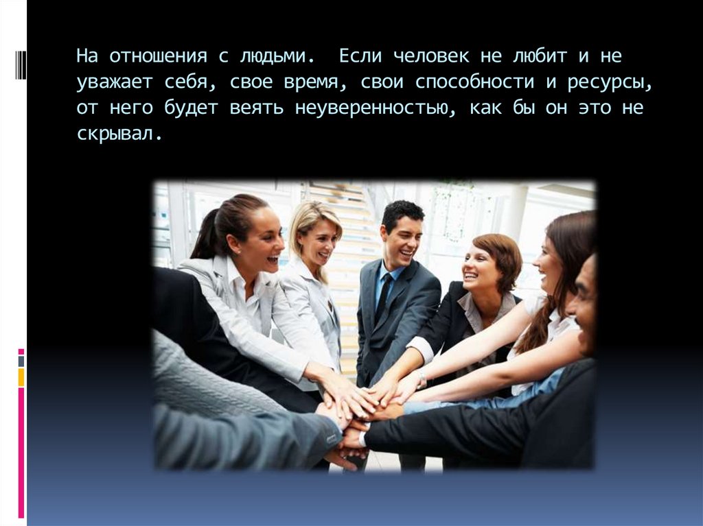 На отношения с людьми. Если человек не любит и неуважает себя, свое время, свои способности и ресурсы,
