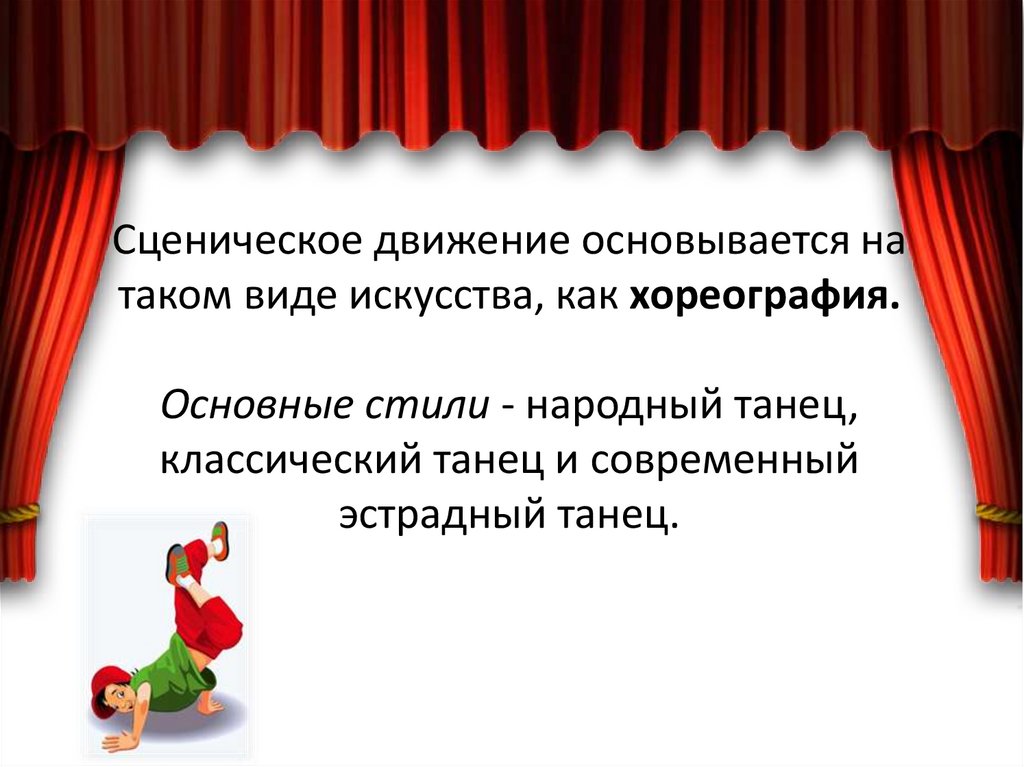 Сценическое движение основывается натаком виде искусства, как хореография.