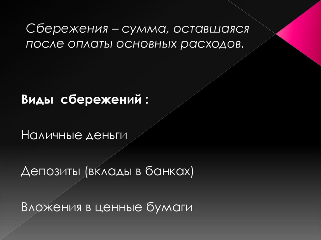 Сбережения – сумма, оставшаясяпосле оплаты основных расходов.