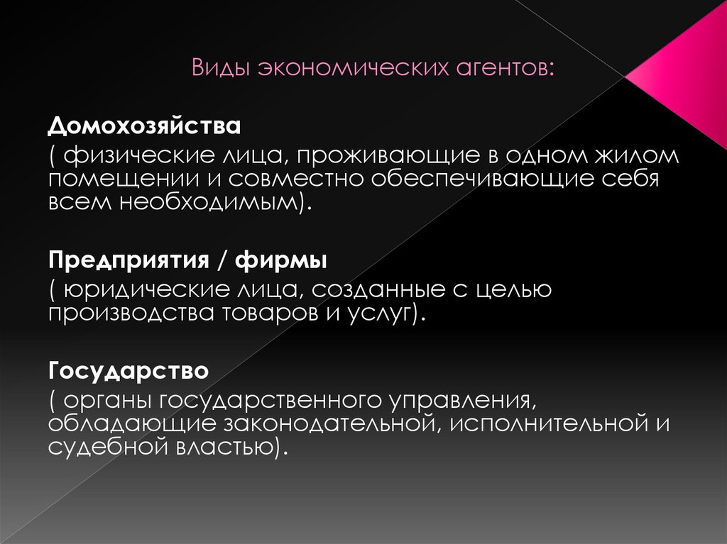 Виды экономических агентов:Домохозяйства