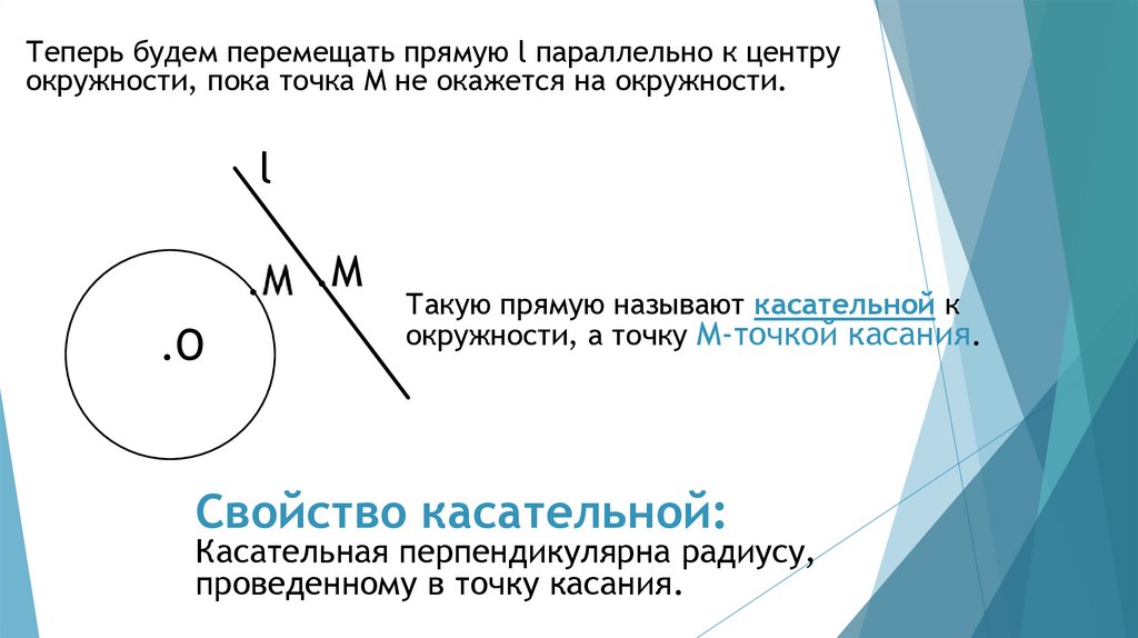 Теперь будем перемещать прямую l параллельно к центруокружности, пока точка М не окажется на окружности.