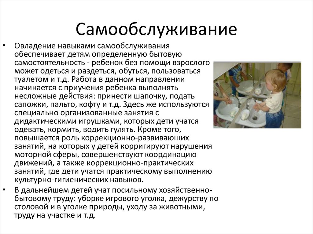 • В дальнейшем детей учат посильному хозяйственнобытовому труду: уборке игрового уголка, дежурству по