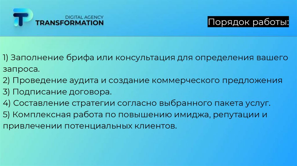 Порядок работы:1) Заполнение брифа или консультация для определения вашего