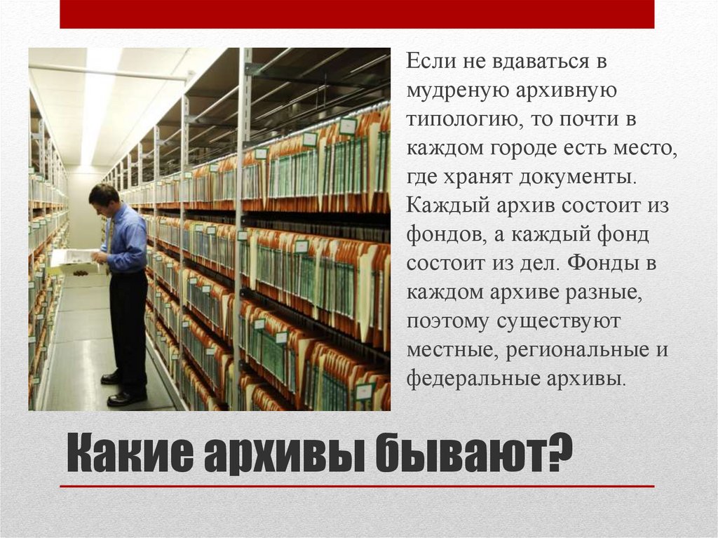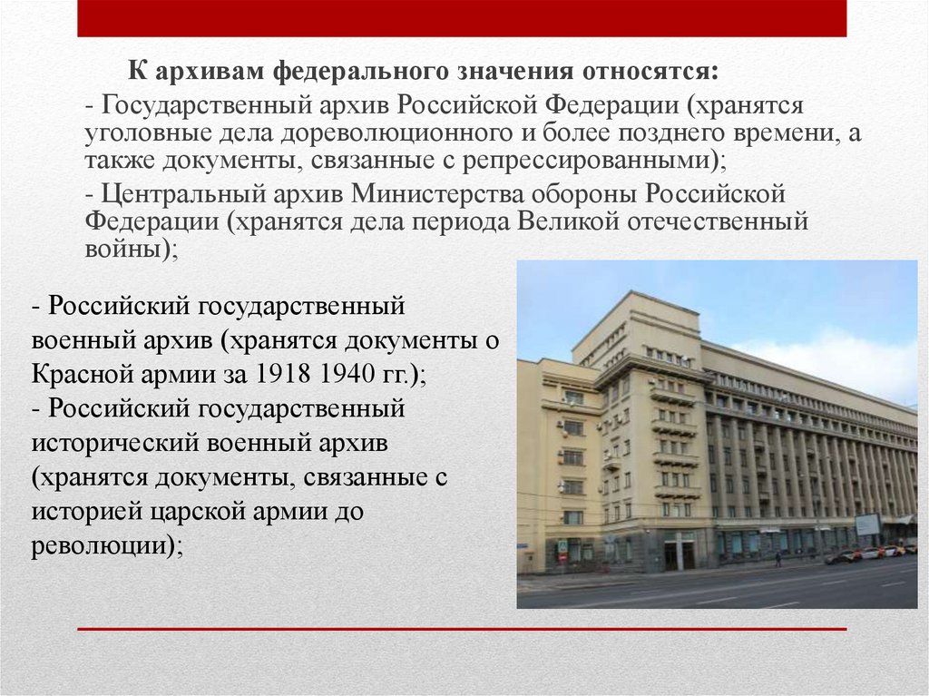 К архивам федерального значения относятся:- Государственный архив Российской Федерации (хранятся