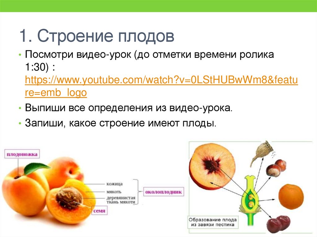 1. Строение плодов• Посмотри видео-урок (до отметки времени ролика