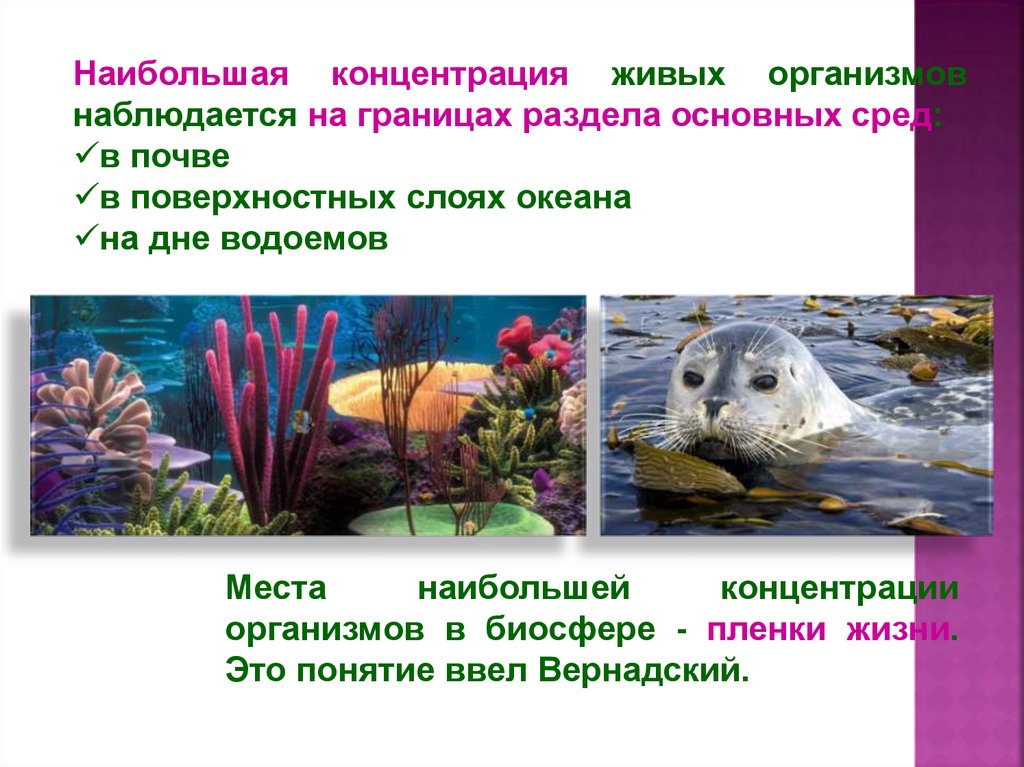 Наибольшая концентрация живых организмовнаблюдается на границах раздела основных сред: