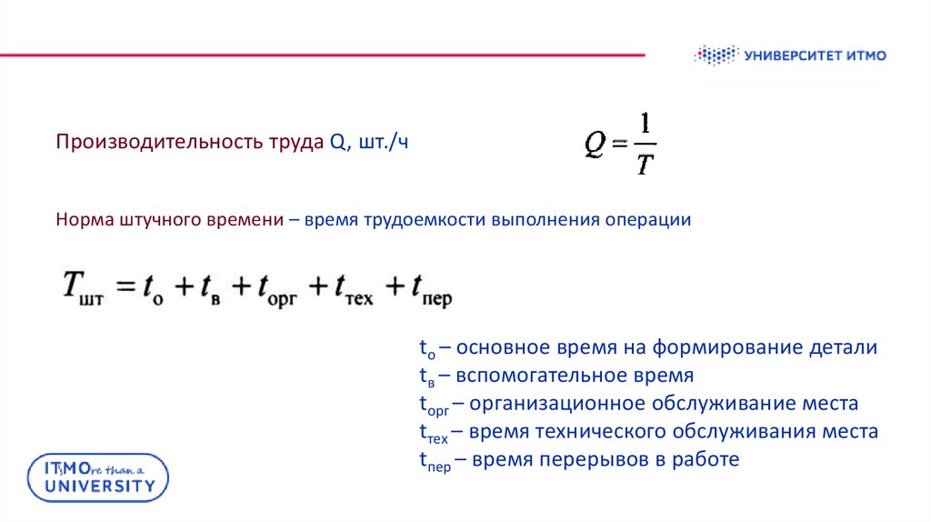 Производительность труда Q, шт./чНорма штучного времени – время трудоемкости выполнения операции