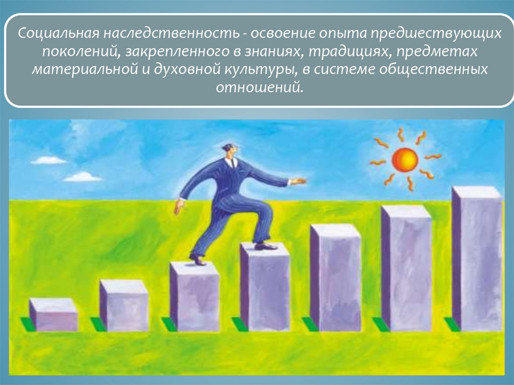 Социальная наследственность - освоение опыта предшествующихпоколений, закрепленного в знаниях, традициях, предметах