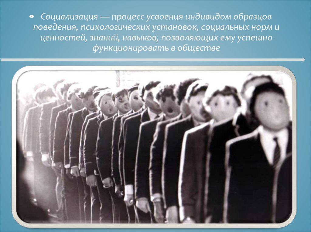 Социализация — процесс усвоения индивидом образцовповедения, психологических установок, социальных норм и