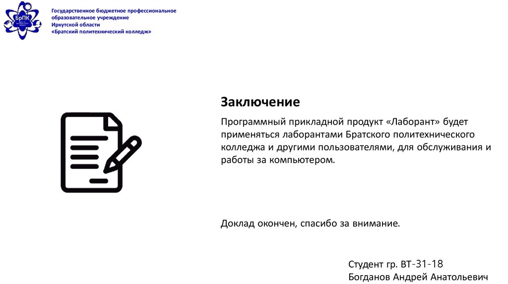 Разработка программного прикладного продукта «Лаборант» для ГБПОУ ИО «БрПК»