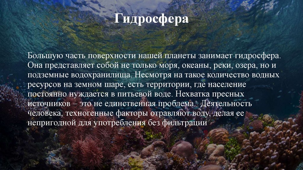 ГидросфераБольшую часть поверхности нашей планеты занимает гидросфера.