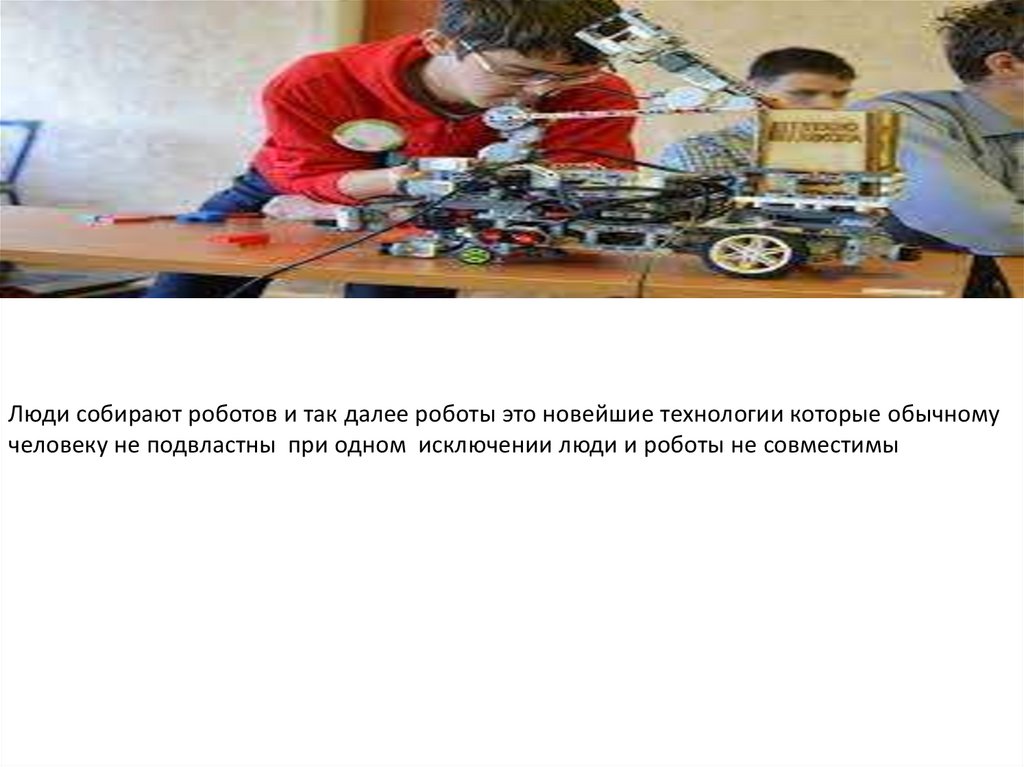 Люди собирают роботов и так далее роботы это новейшие технологии которые обычномучеловеку не подвластны при одном исключении люди и роботы не совместимы