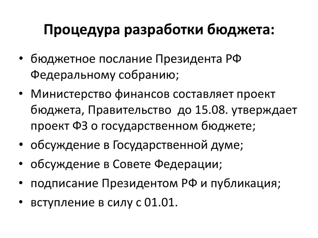 Процедура разработки бюджета:• бюджетное послание Президента РФ