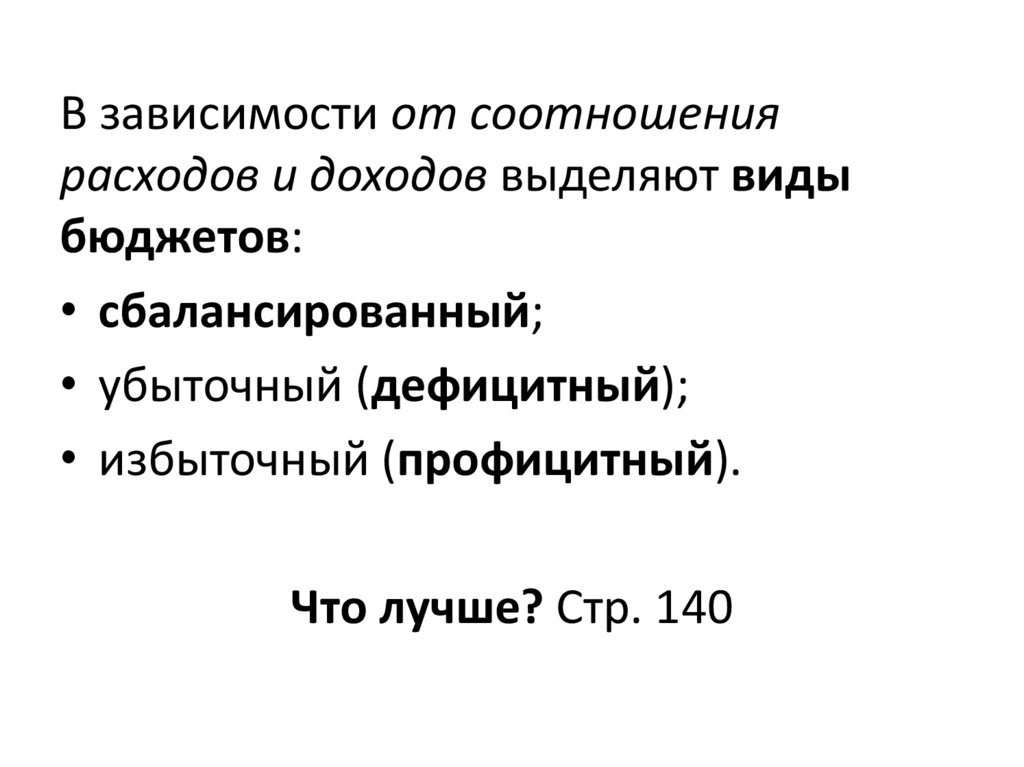 В зависимости от соотношениярасходов и доходов выделяют виды