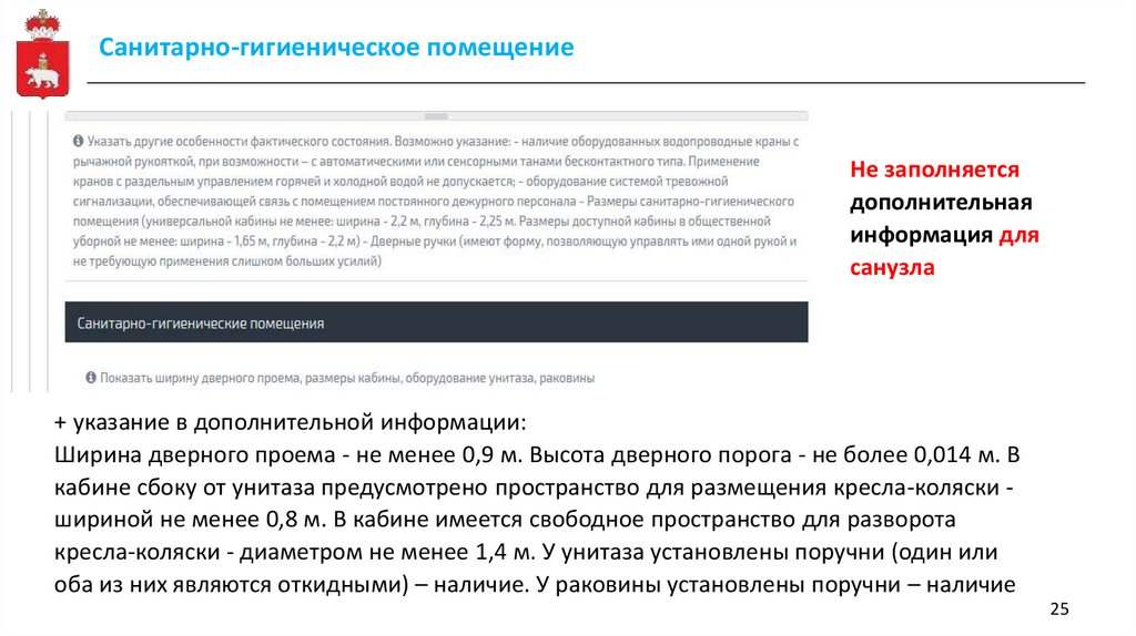кабине сбоку от унитаза предусмотрено пространство для размещения кресла-коляски шириной не менее 0,8 м. В кабине имеется свободное пространство для разворота