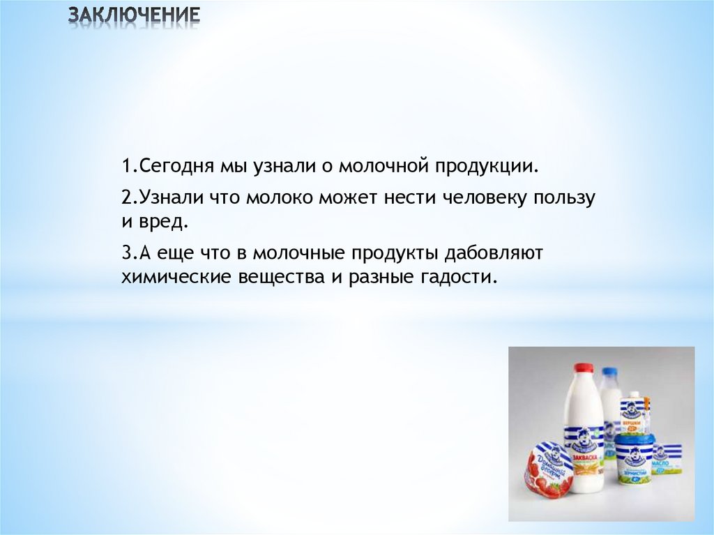 1.Сегодня мы узнали о молочной продукции.2.Узнали что молоко может нести человеку пользу