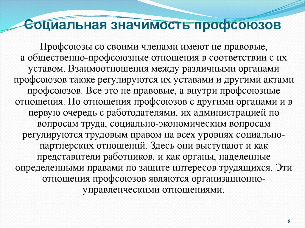 Социальная значимость профсоюзовПрофсоюзы со своими членами имеют не правовые,
