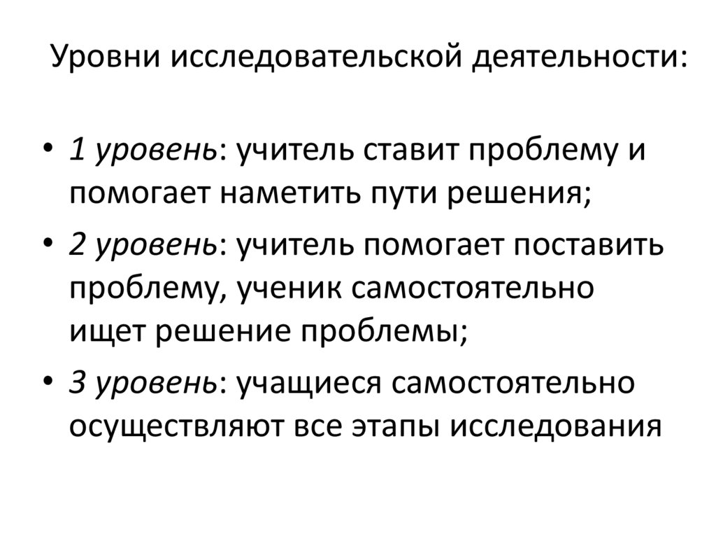 Уровни исследовательской деятельности:• 1 уровень: учитель ставит проблему и