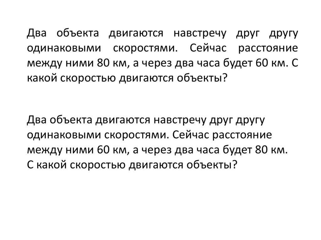 Два объекта двигаются навстречу друг другуодинаковыми скоростями. Сейчас расстояние