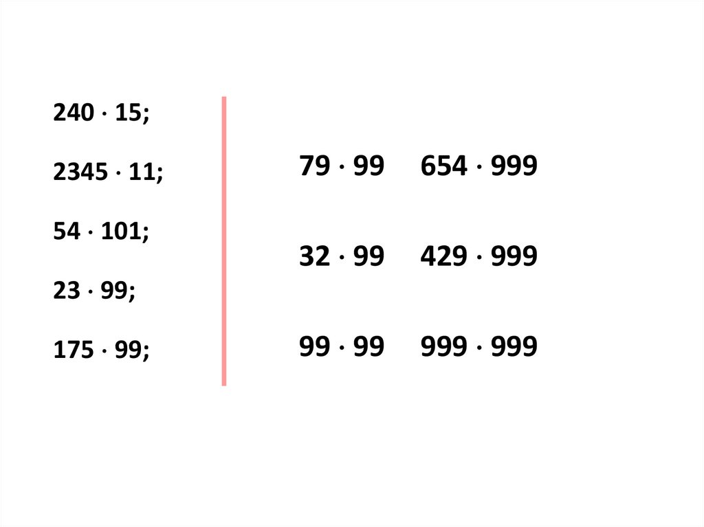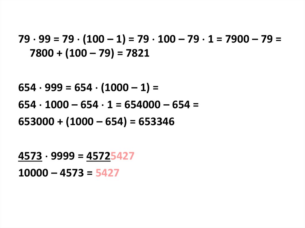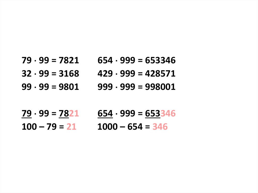 79 99 = 79 (100 – 1) = 79 100 – 79 1 = 7900 – 79 =7800 + (100 – 79) = 7821