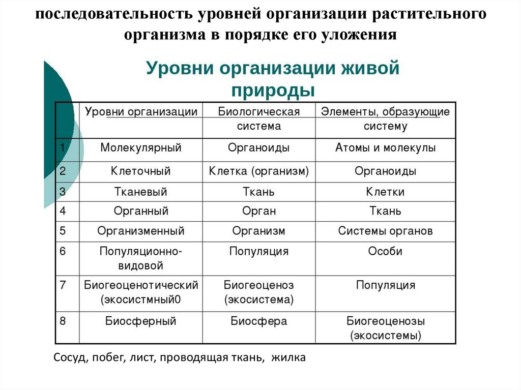 последовательность уровней организации растительногоорганизма в порядке его уложения