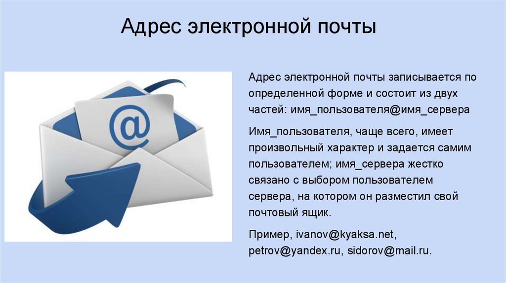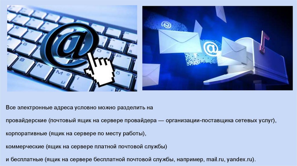 Все электронные адреса условно можно разделить напровайдерские (почтовый ящик на сервере провайдера — организации-поставщика сетевых услуг),