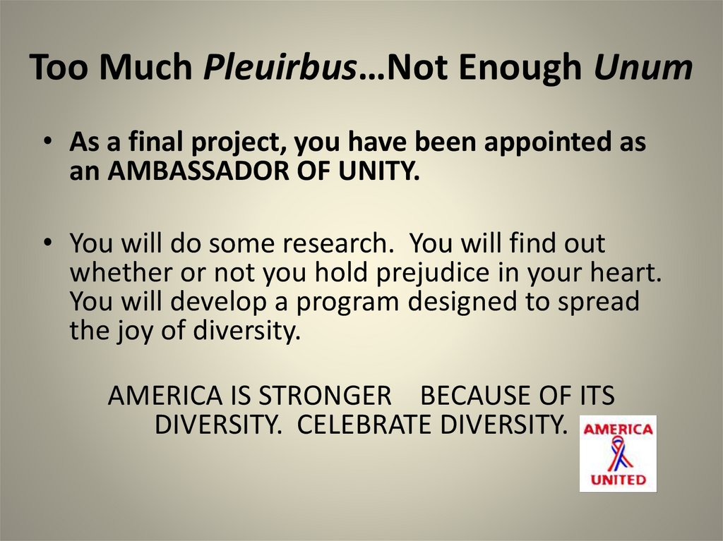 Too Much Pleuirbus…Not Enough Unum• As a final project, you have been appointed as