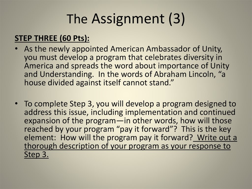 the issue of promoting unity in America. Be sure to provide a sentence or two