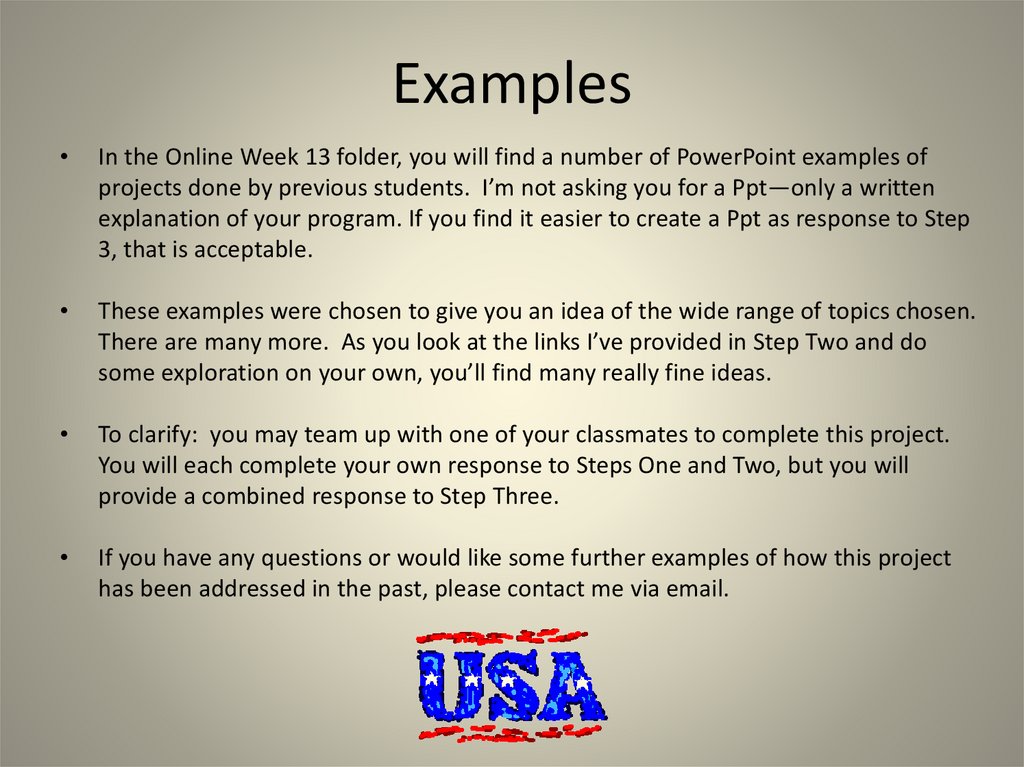 ExamplesIn the Online Week 13 folder, you will find a number of PowerPoint examples of