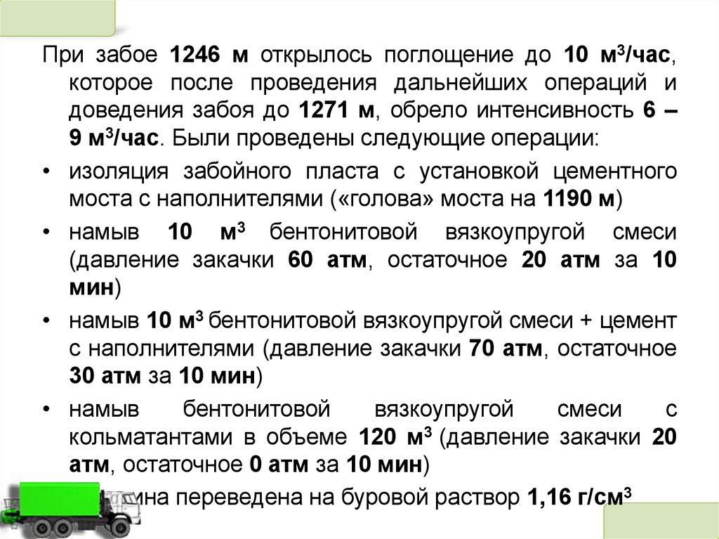 При забое 1246 м открылось поглощение до 10 м3/час,которое после проведения дальнейших операций и