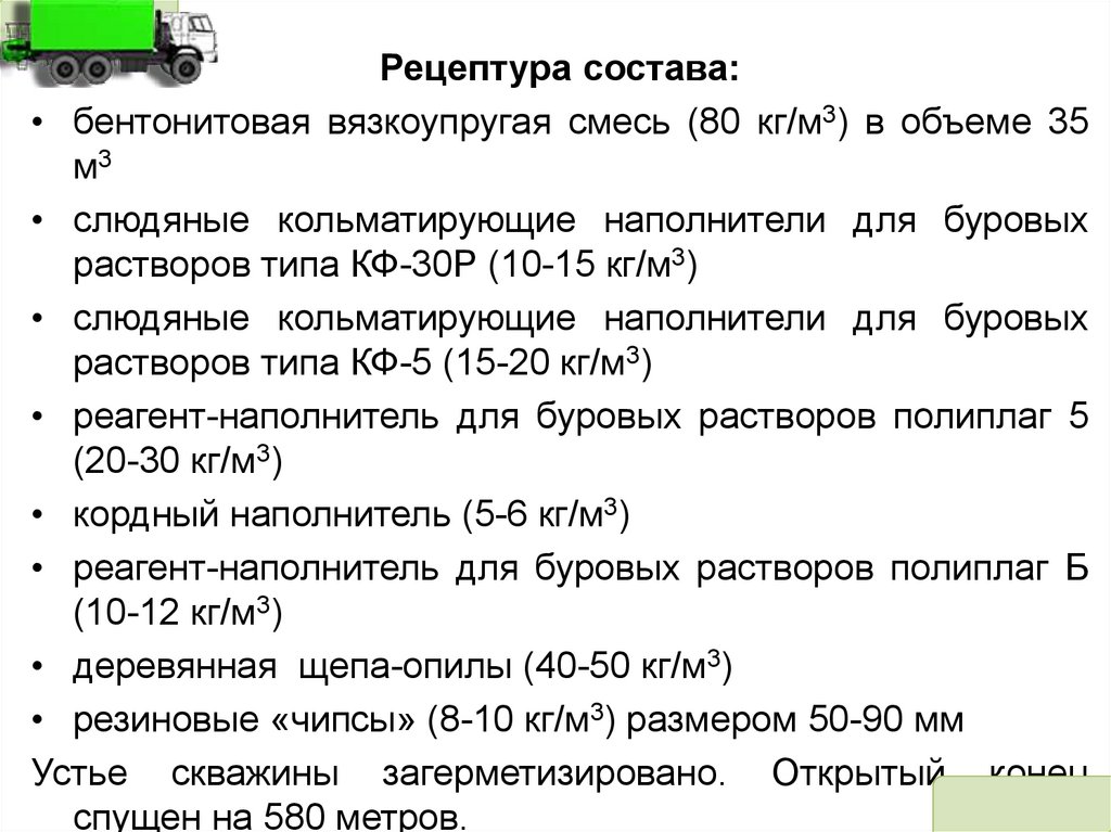 Рецептура состава:• бентонитовая вязкоупругая смесь (80 кг/м3) в объеме 35