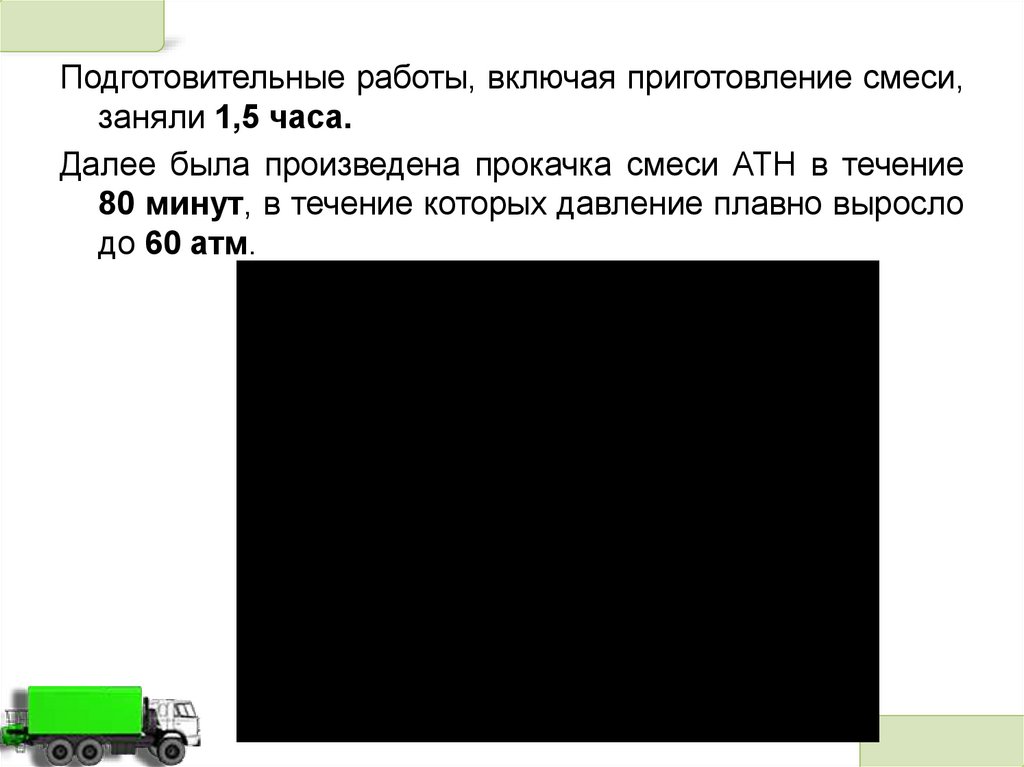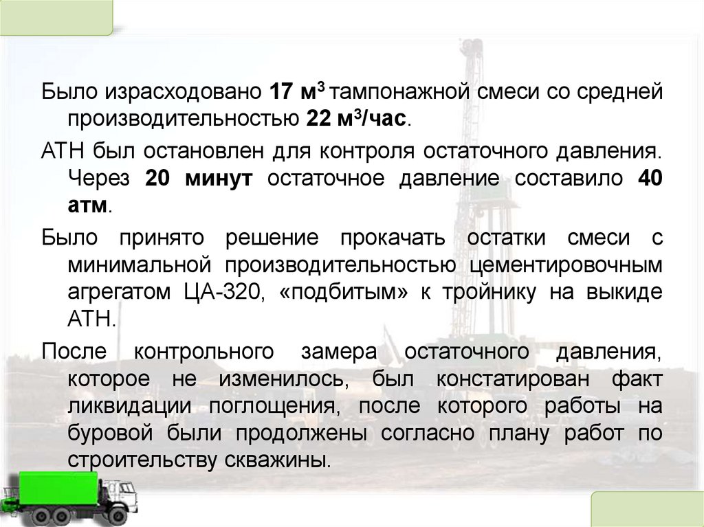 Было израсходовано 17 м3 тампонажной смеси со среднейпроизводительностью 22 м3/час.