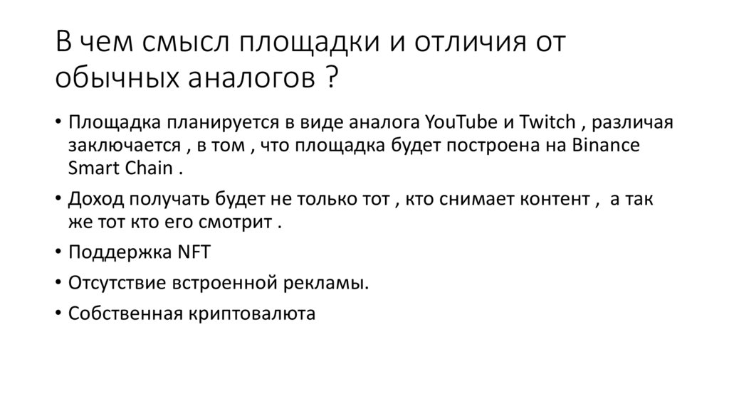 • Площадка планируется в виде аналога YouTube и Twitch , различая