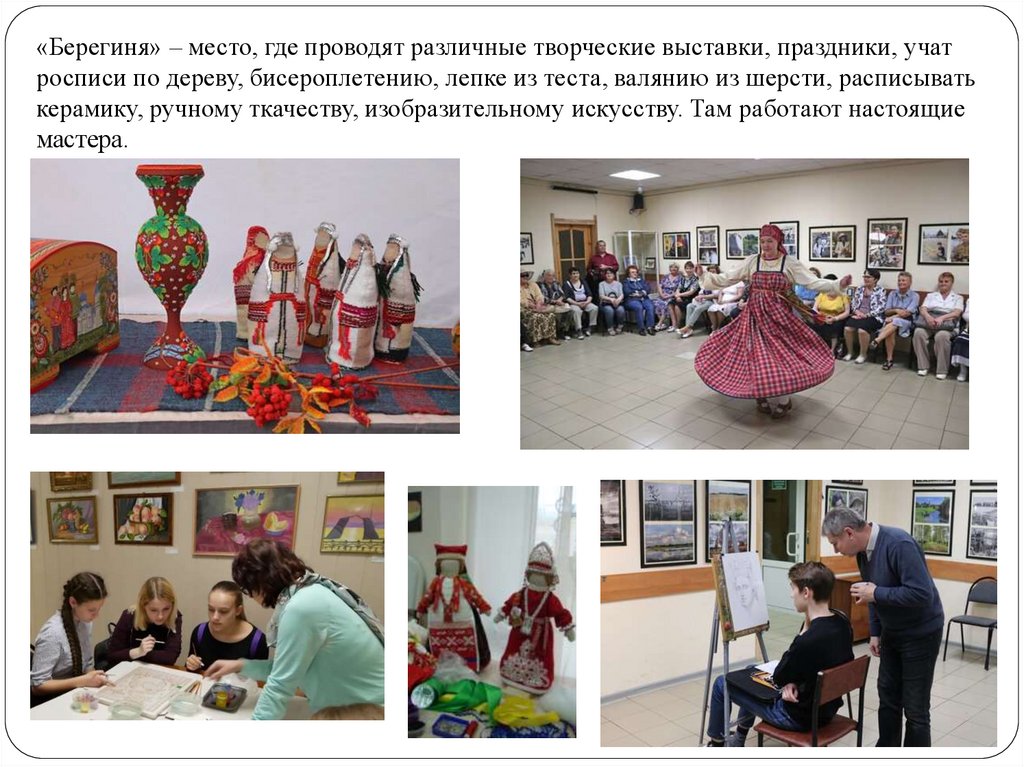 «Берегиня» – место, где проводят различные творческие выставки, праздники, учатросписи по дереву, бисероплетению, лепке из теста, валянию из шерсти, расписывать